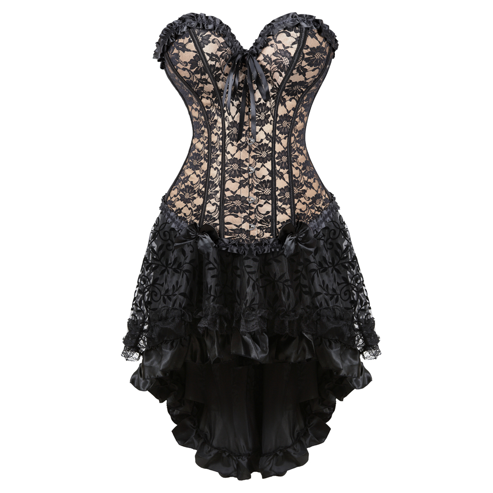 Corset and Skirt Steampunk Gothic Slimming Lace Overlay Bustier Dress Lace Up Boned Korsage Sexy Femme Carnival Party Clubwear