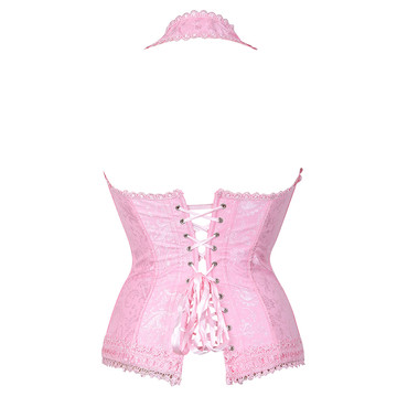 4. Fashion elegant halter satin jacquard weave corset, 2 rows of hook and eye closure in the front, prefect floral embroidery edge decoration can improve your glamours, ribbon lacing in back for cinching, matching g-string.